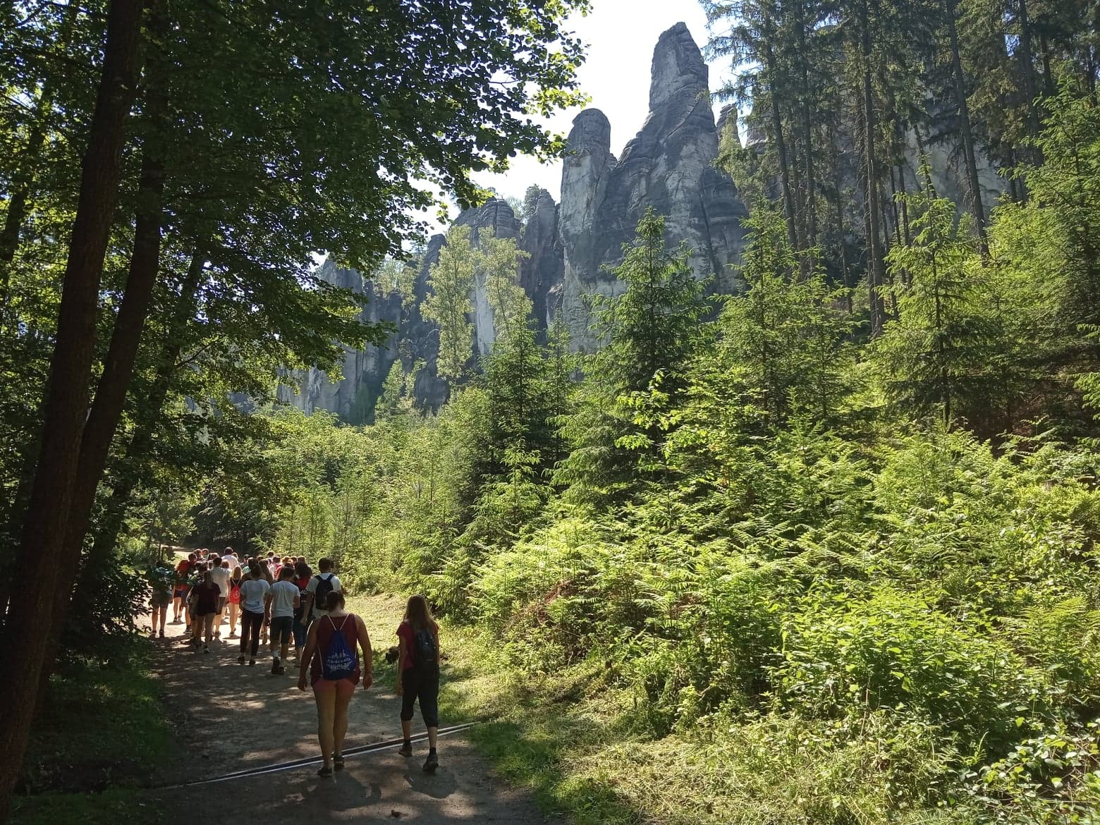 Dnes (5. 6. 2019) jsme vyrazili s deváťáky do oblasti Českého ráje. Prvním cílem byla komentovaná prohlídka pískovny v Hrdoňovicích. Dozvěděli jsme se o písku vše: těžba, zpracování, třídění a využití. Exkurze byla rozšířením učiva přírodopisu o usazených horninách a jejich využití v běžném životě. Mohli jsme z hrany lomu sledovat odstřel části horniny. Vzhledem k velmi teplému počasí jsme se přesunuli do chladných roklí Prachovských skal. Zde jsme se prošli po dně bývalého druhohorního moře a mohli obdivovat, jak mráz, voda a vítr zformovaly sedimenty do dnešní podoby pískovcového skalního města.