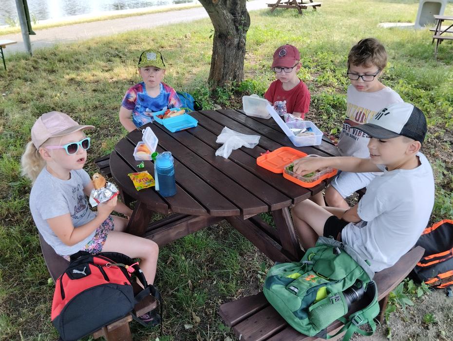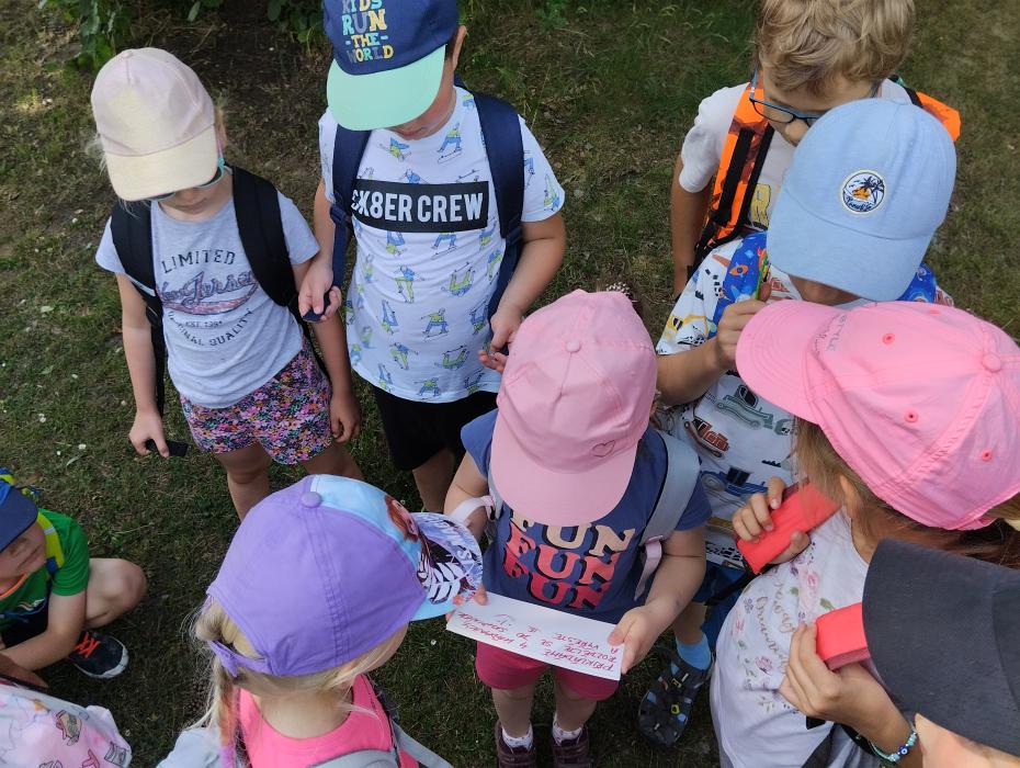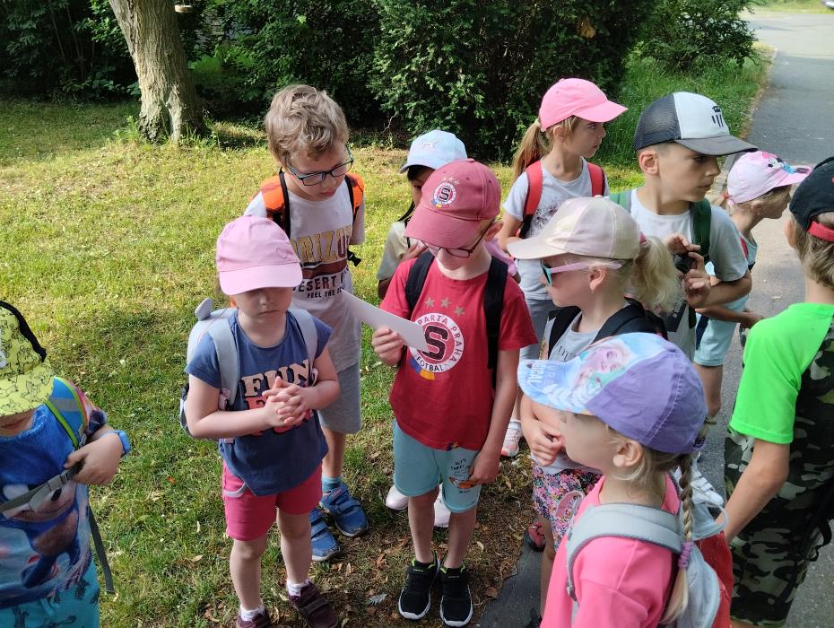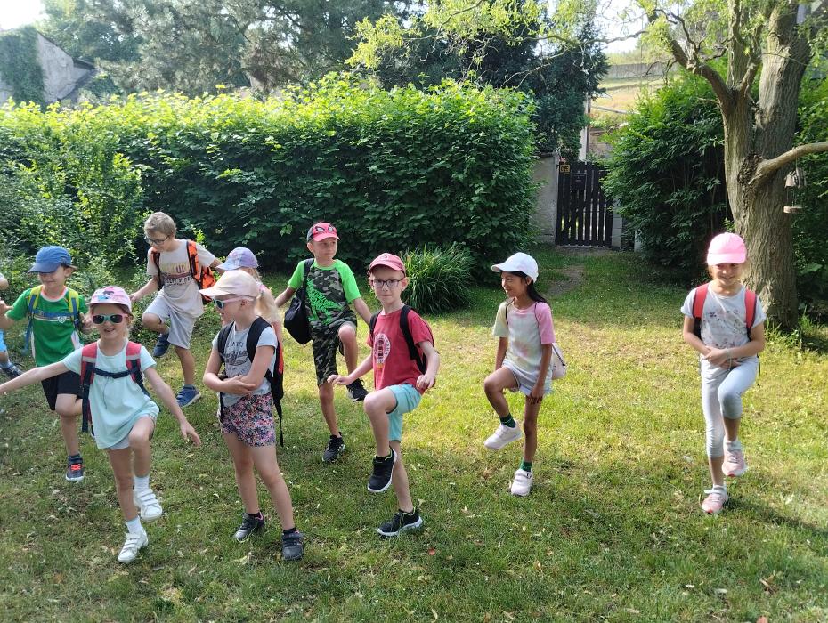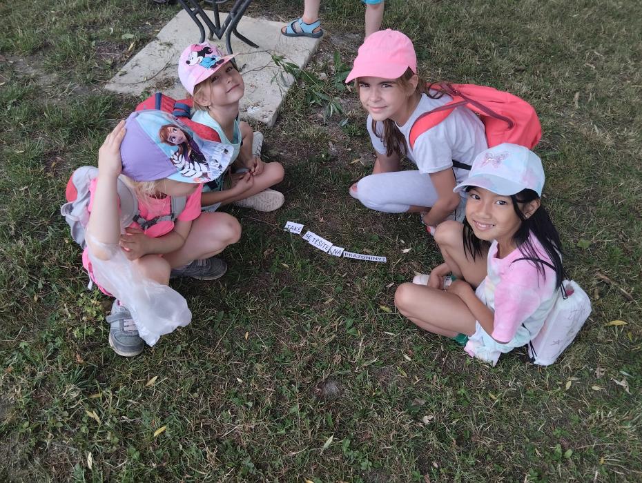 našli jsme cestou 2 malované putovní kamínky, pozorovali srnečku a v horkém počasí jsme šli krásně ve stínu. Poslední úkol byl ten nejdůležitější, v něm jsme se totiž konečně dozvěděli, kde se společně setkáme a kam nás deváťáci zavedou! Z posledních sil jsme se „doplazili“ k cukrárně a tam na nás čekala ta nejlepší odměna za všechny splněné úkoly – zmrzka! Moc děkujeme našim starším