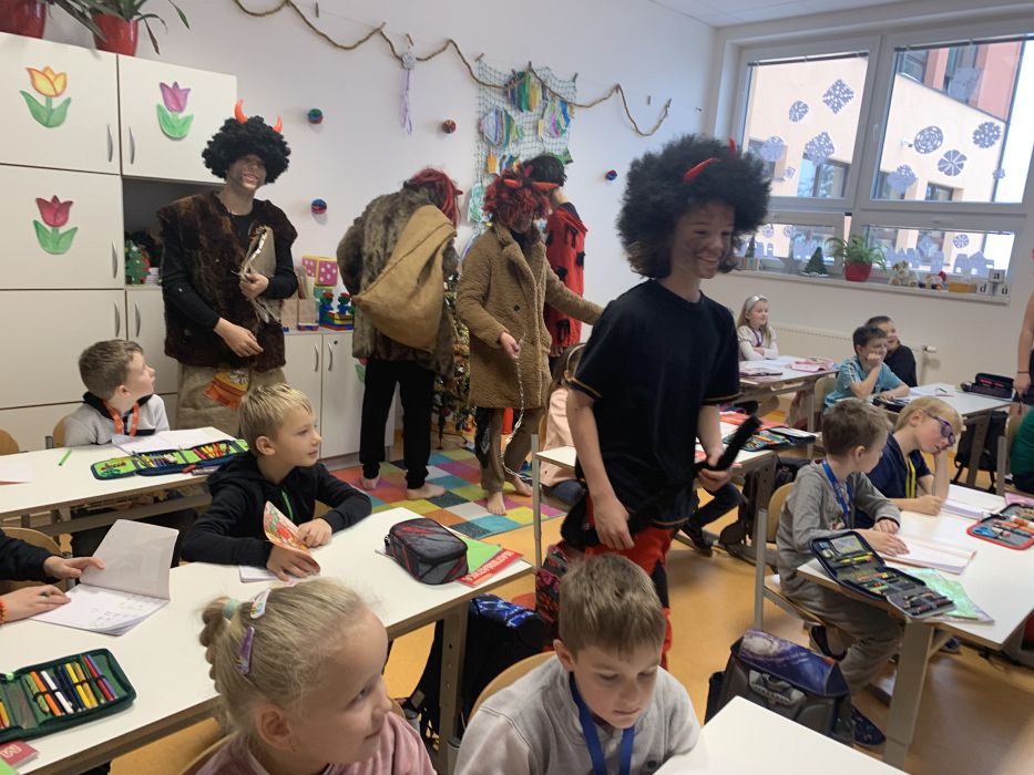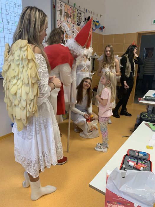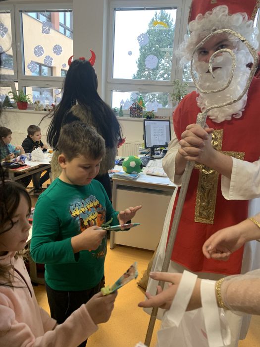 Do naší třídy přišel svatý Mikuláš, čerti a andělé. Společně jsme jim zazpívali písničku a dostali nejen sladkou odměnu, ale každý prvňáček dostal i své nové pero.