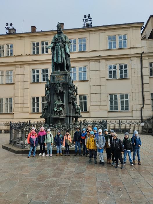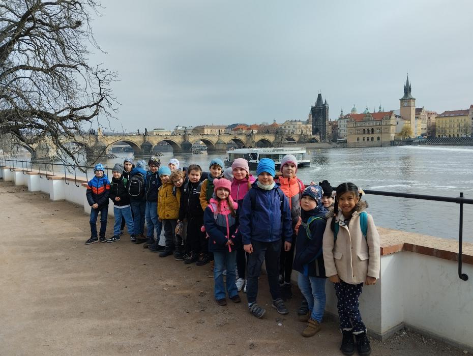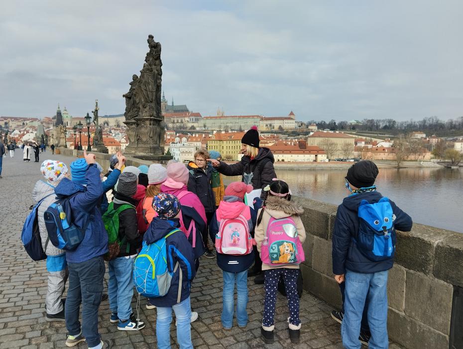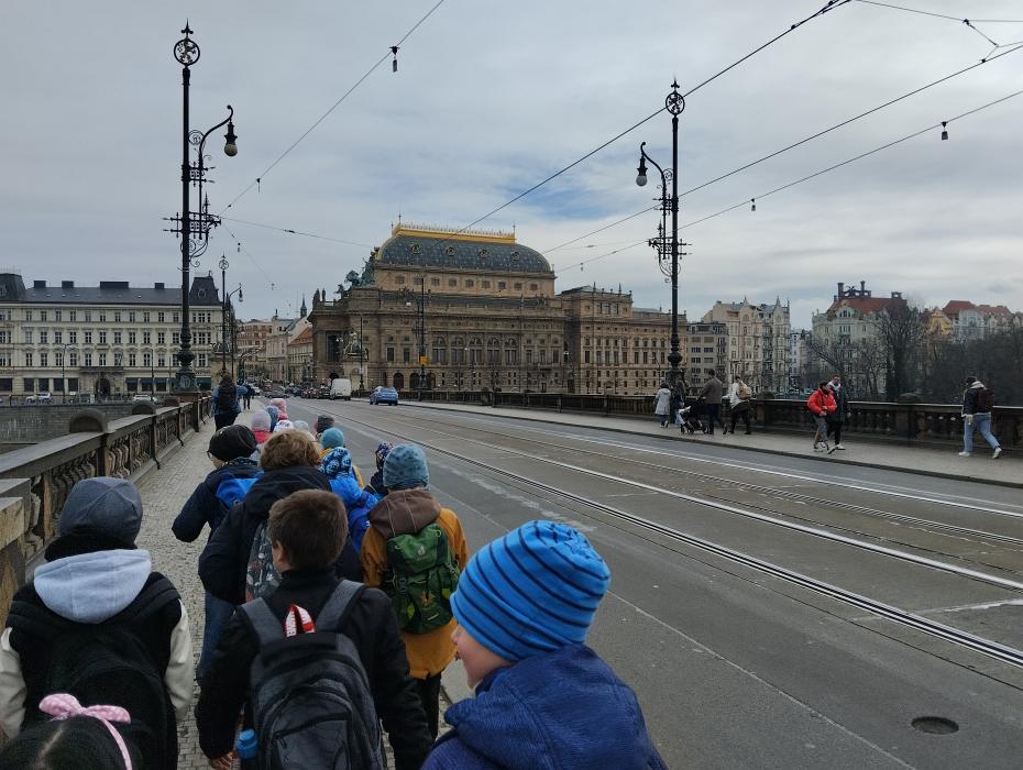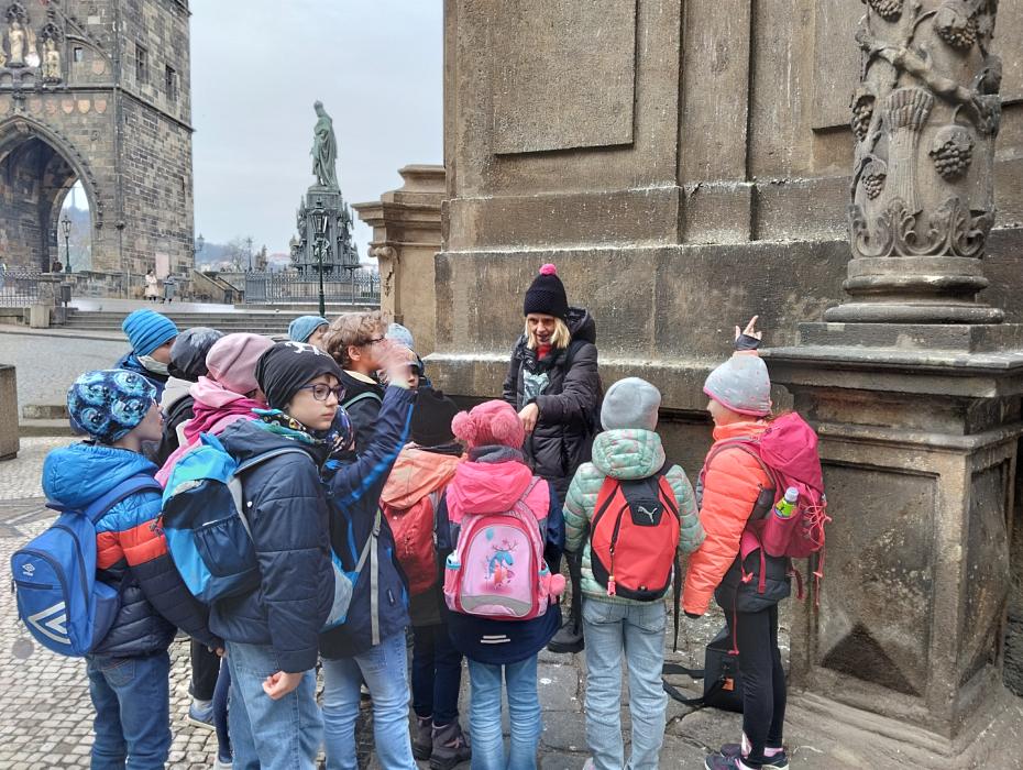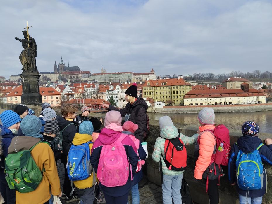 Na čtvrteční den jsme se všichni těšili, neboť jsme si naplánovali exkurzi po Karlově mostě a jako bonus bojovku na Kampě. Cesta vlakem byla pohodlná, tramvají zábavná a po svačince na Křížovnickém náměstí už nás čekalo slibované dobrodružství. Paní průvodkyně z „Praha hravě“ si pro nás připravila zajímavou komentovanou prohlídku, která byla ale plná otázek a to pro nás byla výzva! Neboť každá správná odpověď přinesla do týmu zlaťák a za těžkou otázku byl dokonce diamant! I když jsme se na otázky nijak nepřipravovali, ukázalo se, že víme víc, než si myslíme Poslechli jsme si legendy o sv. Janu Nepomuckém, sv. Václavovi, sv. Juditě, sv. Bruncvíkovi či Karlu IV. a také jsme se dozvěděli, proč je na Staroměstské mostecké věži zrovna ledňáček – víte proč? Aby chránil most před nepříznivým počasím. A víte, jak si zapamatovat letopočet postavení Karlova mostu? Jsou to samá lichá čísla – 1357 Na Kampě nám paní zadala ještě pár úkolů ke splnění a poté vyhlásila vítěze ve sběru zlaťáků. Odměněni byli všichni nejen bonbony, ale především novými informacemi a skvělým zážitkem. Zpáteční cestou na nádraží jsme se kochali výhledem na Národní divadlo a zcela uťapkaní jsme si s vděkem sedli do vlaku a vyprávěli si své dojmy a pocity. Následující den jsme ve škole o prvouce vytvořili plakát s našimi zážitky z výletu v písemné i výtvarné podobě – a vy se na něj můžete podívat ve vestibulu školy, kde je vystavený.