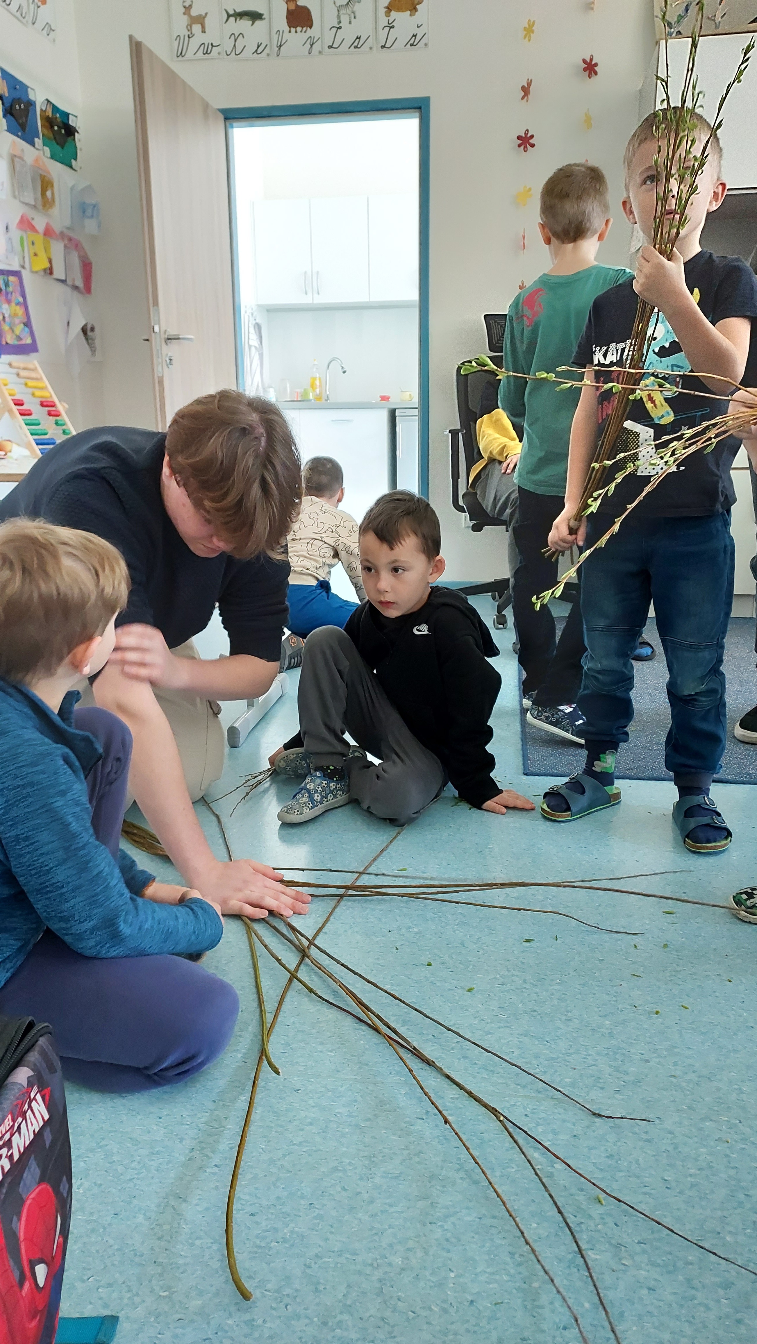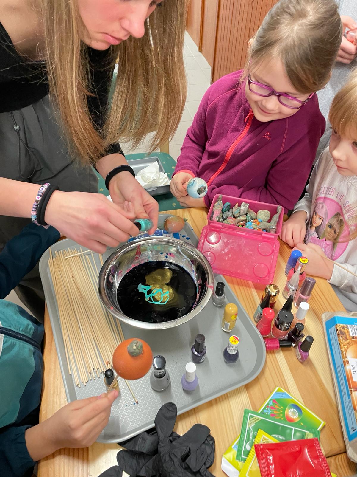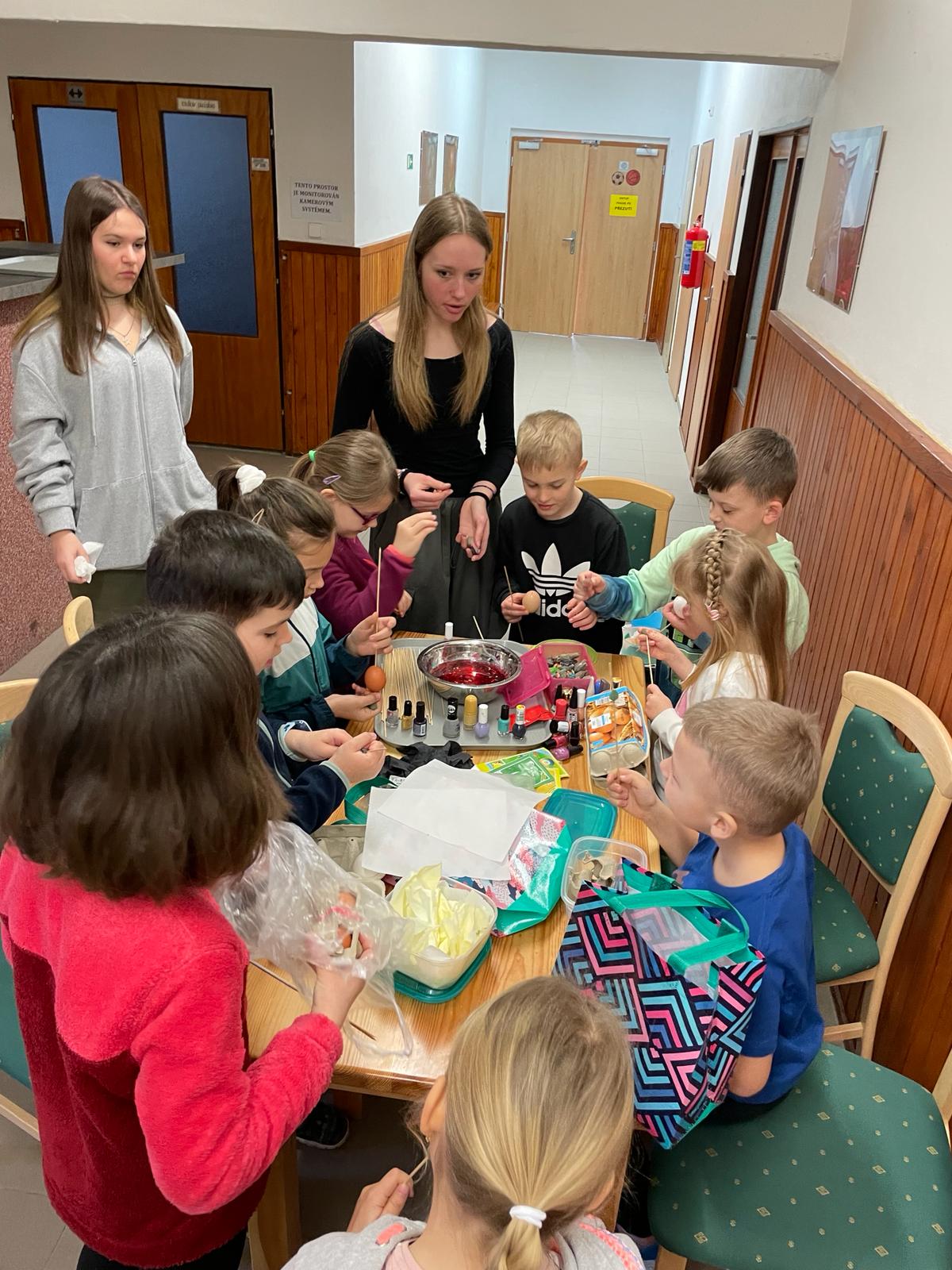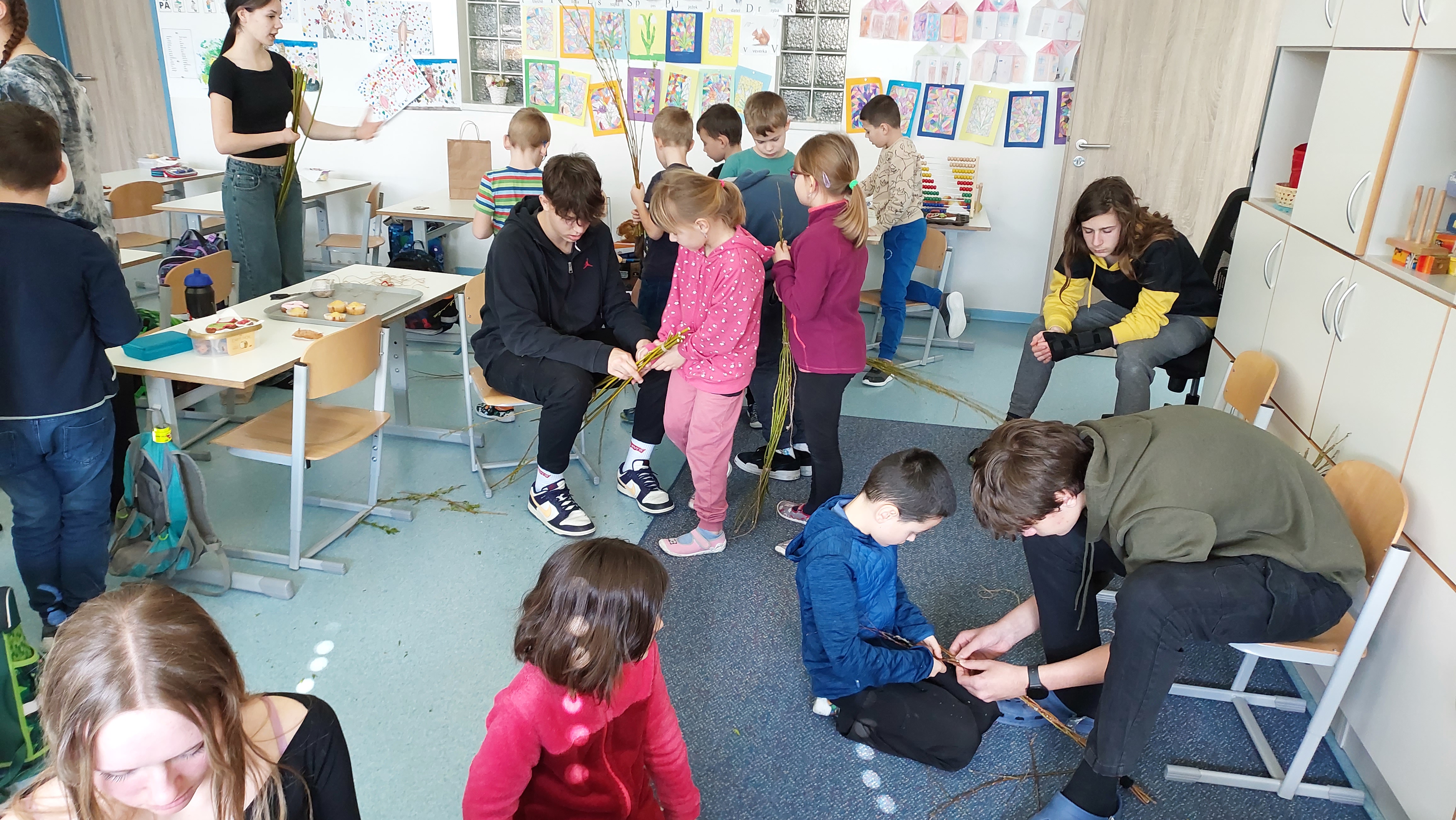Děti z 1. D strávily hezký den společně se svou partnerskou třídou 9.C. Deváťáci si připravili pestrý program zaměřený na velikonoční tvoření. Byli perfektně nachystáni. Dopředu upekli perníčky ke zdobení, některé jsme rozvalovali a pekli až na místě z již připraveného těsta. Ovšem těsto na muffiny si děti podle receptu připravily samy, mohly si dokonce vybrat, zda mají chuť na muffin vanilkový, nebo kakaový. Před školní kuchyňkou vznikla výtvarná dílna, kde se děti naučily zajímavou techniku barvení kraslic pomocí potravinářských barev a laku na nehty. Než se vše uklidilo, zaschlo a vystydlo, zahrály si děti hry v tělocvičně. Pak jsme se přesunuli do třídy, pochutnali si na muffinech s ovocnou pěnou a vrhli se na pletení pomlázek. Den utekl neuvěřitelně rychle a děti si ho skvěle užily, věřím, že obě zúčastněné party. Deváťákům ještě jednou moc děkuji za příjemně prožitý den, plný bezvadných nápadů i nezměrné trpělivosti s mladšími parťáky. Velmi oceňuji, že celý program vznikl z jejich vlastní iniciativy!