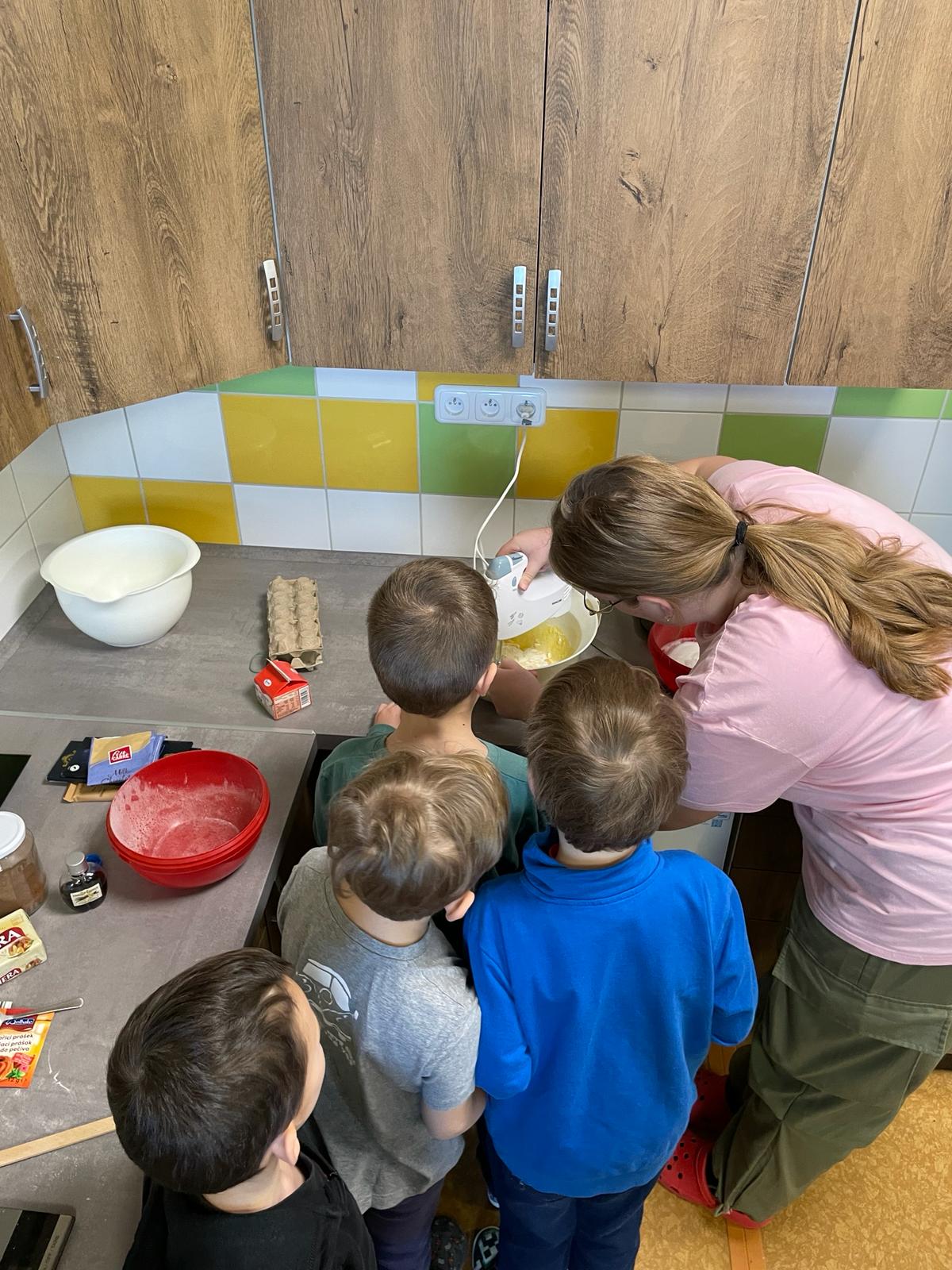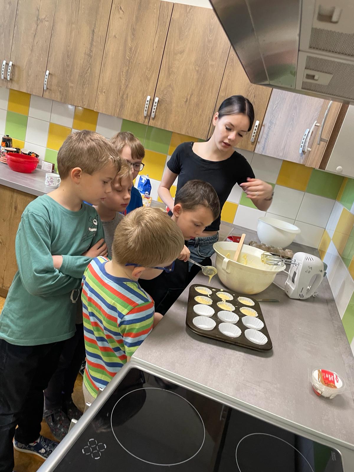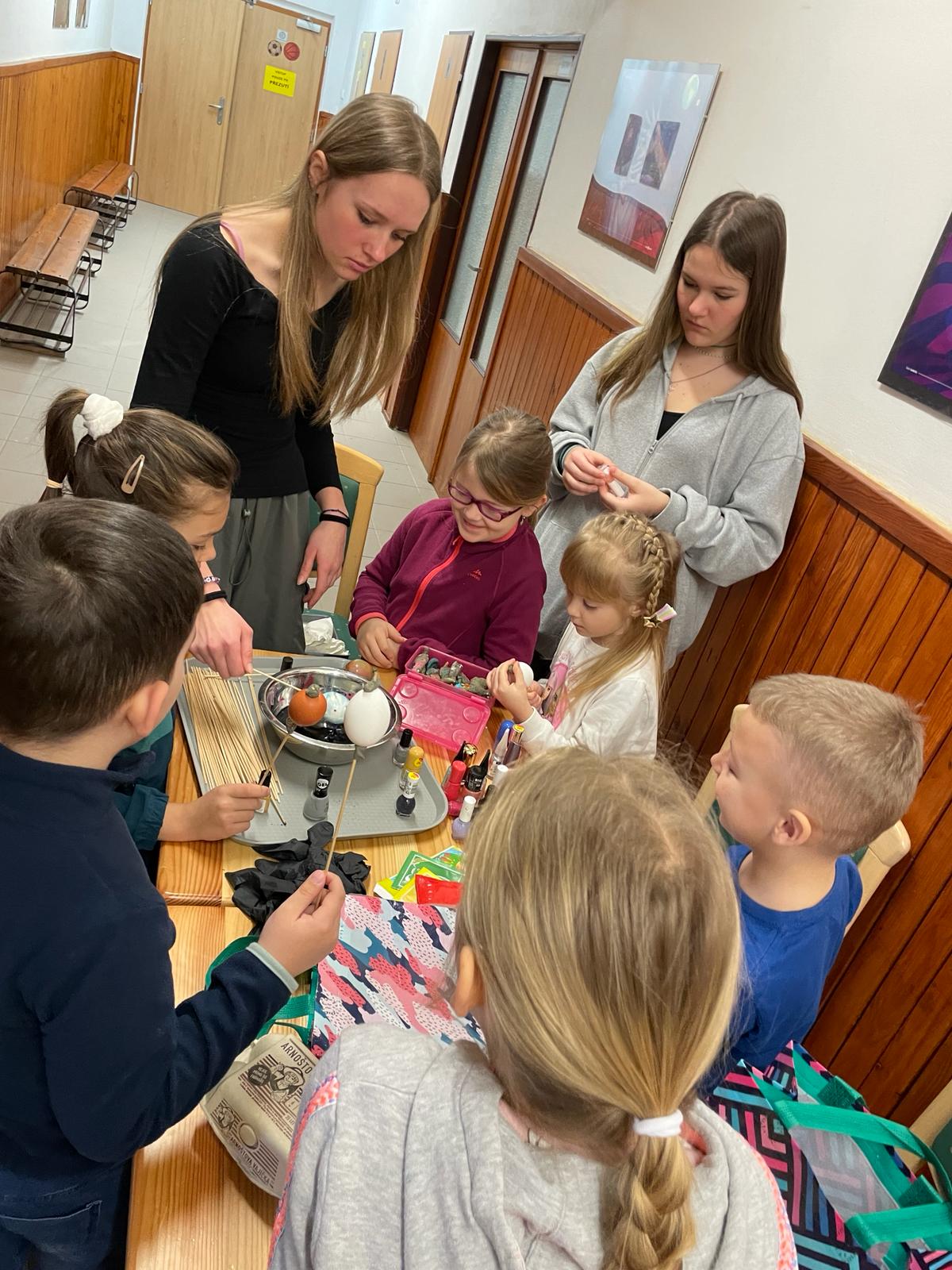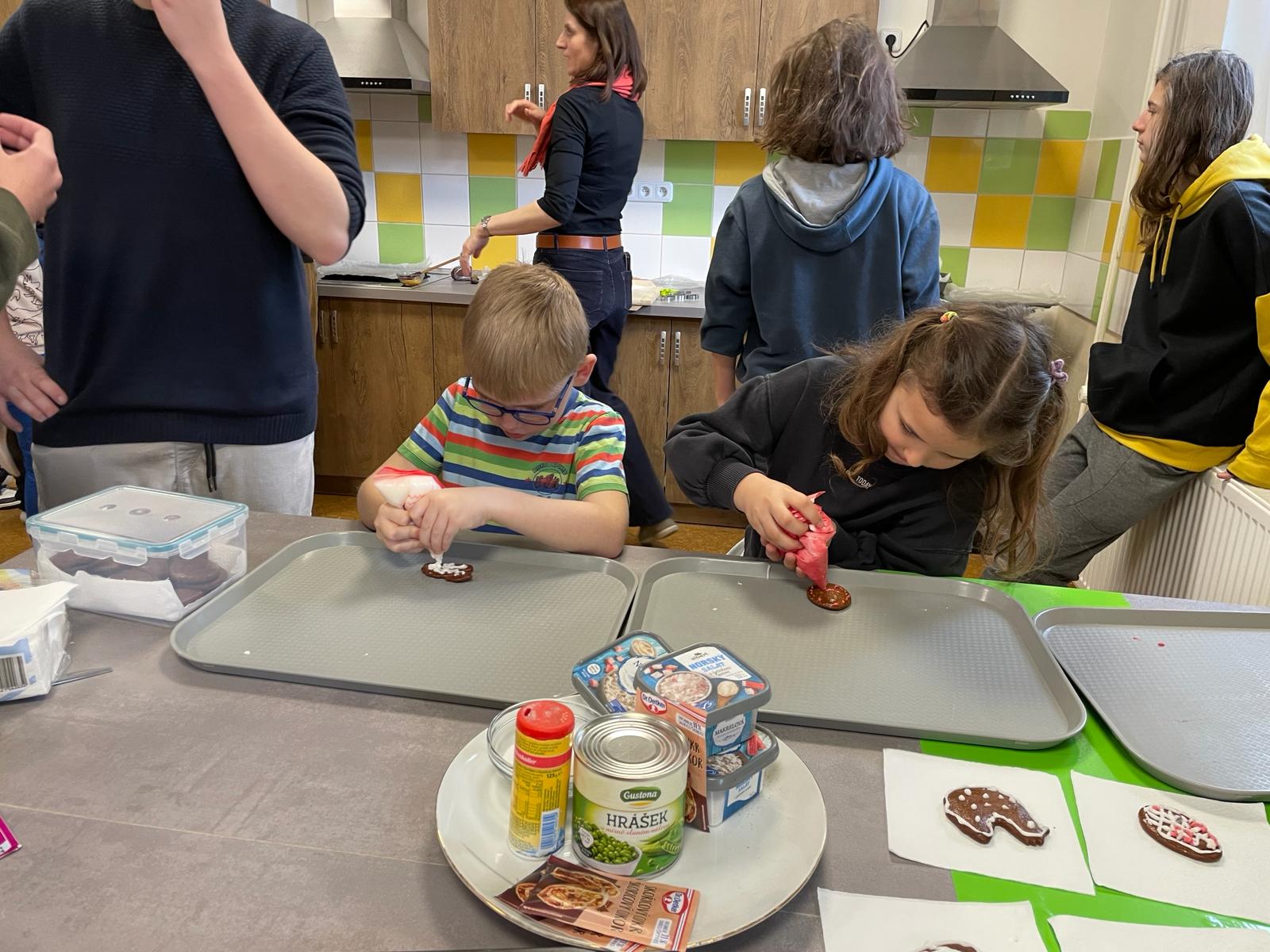Děti z 1. D strávily hezký den společně se svou partnerskou třídou 9.C. Deváťáci si připravili pestrý program zaměřený na velikonoční tvoření. Byli perfektně nachystáni. Dopředu upekli perníčky ke zdobení, některé jsme rozvalovali a pekli až na místě z již připraveného těsta. Ovšem těsto na muffiny si děti podle receptu připravily samy, mohly si dokonce vybrat, zda mají chuť na muffin vanilkový, nebo kakaový. Před školní kuchyňkou vznikla výtvarná dílna, kde se děti naučily zajímavou techniku barvení kraslic pomocí potravinářských barev a laku na nehty. Než se vše uklidilo, zaschlo a vystydlo, zahrály si děti hry v tělocvičně. Pak jsme se přesunuli do třídy, pochutnali si na muffinech s ovocnou pěnou a vrhli se na pletení pomlázek. Den utekl neuvěřitelně rychle a děti si ho skvěle užily, věřím, že obě zúčastněné party. Deváťákům ještě jednou moc děkuji za příjemně prožitý den, plný bezvadných nápadů i nezměrné trpělivosti s mladšími parťáky. Velmi oceňuji, že celý program vznikl z jejich vlastní iniciativy!