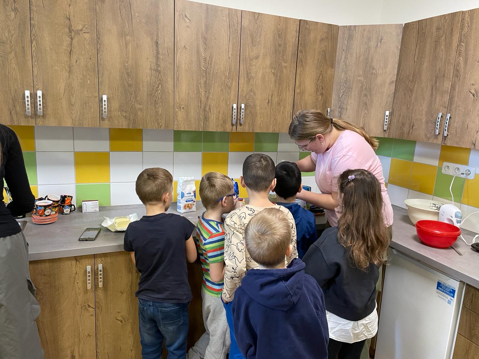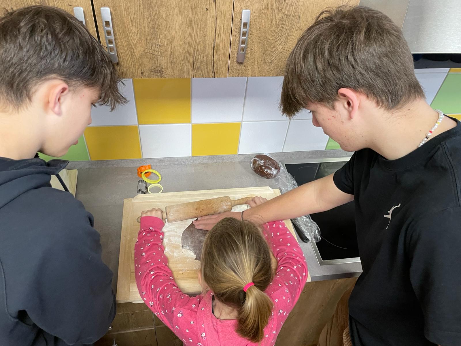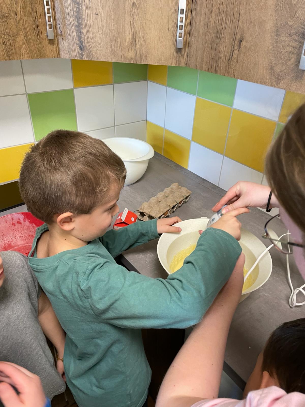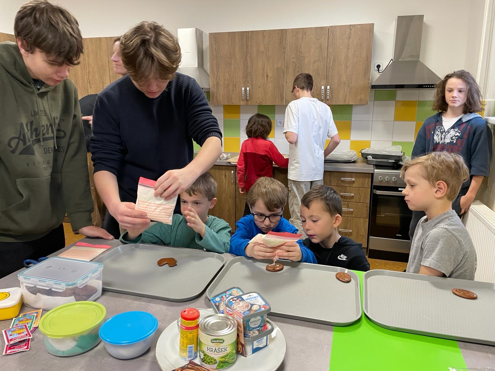 Děti z 1. D strávily hezký den společně se svou partnerskou třídou 9.C. Deváťáci si připravili pestrý program zaměřený na velikonoční tvoření. Byli perfektně nachystáni. Dopředu upekli perníčky ke zdobení, některé jsme rozvalovali a pekli až na místě z již připraveného těsta. Ovšem těsto na muffiny si děti podle receptu připravily samy, mohly si dokonce vybrat, zda mají chuť na muffin vanilkový, nebo kakaový. Před školní kuchyňkou vznikla výtvarná dílna, kde se děti naučily zajímavou techniku barvení kraslic pomocí potravinářských barev a laku na nehty. Než se vše uklidilo, zaschlo a vystydlo, zahrály si děti hry v tělocvičně. Pak jsme se přesunuli do třídy, pochutnali si na muffinech s ovocnou pěnou a vrhli se na pletení pomlázek. Den utekl neuvěřitelně rychle a děti si ho skvěle užily, věřím, že obě zúčastněné party. Deváťákům ještě jednou moc děkuji za příjemně prožitý den, plný bezvadných nápadů i nezměrné trpělivosti s mladšími parťáky. Velmi oceňuji, že celý program vznikl z jejich vlastní iniciativy!
