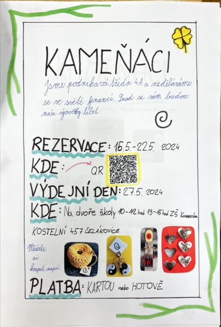 Jsme podnikavá třída 4.A, založili jsme společně firmu nesoucí název KAMEŇÁCI. Spolupracujeme s Českou spořitelnou, a.s. na projektu podpory Finanční gramotnosti dětí. 15. 5. 2024 budou naše výrobky uvedeny do prodeje prostřednictvím E-SHOPU na adrese: https://ejarmarky.abecedapenez.cz/detail/cltpwfcxg3c5o0765k2mlho4t nebo můžete využít QR kód níže. Můžete se těšit na krásnou ruční práci, kdy každý výrobek je opravdu originál. Najdete u nás převážně keramické šperky, misky, mísy, podtácky, štěstí do kapsy, ježky, ale i drobnosti v podobě záložky do knížky, voňavého mýdla či hakisaku. Pokud se nám vše vydaří, jak jsme si naplánovali a naše firma bude zisková, adoptujeme nějaká zvířátka v ZOO Praha nebo se je pokusíme alespoň sponzorovat. Také bychom si rádi udělali radost ke Dni dětí nějakou společnou aktivitou.
