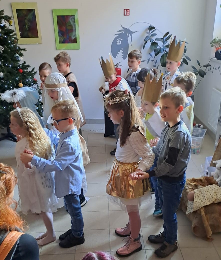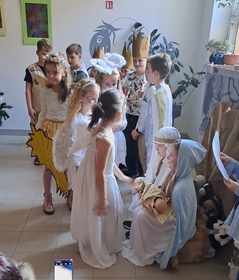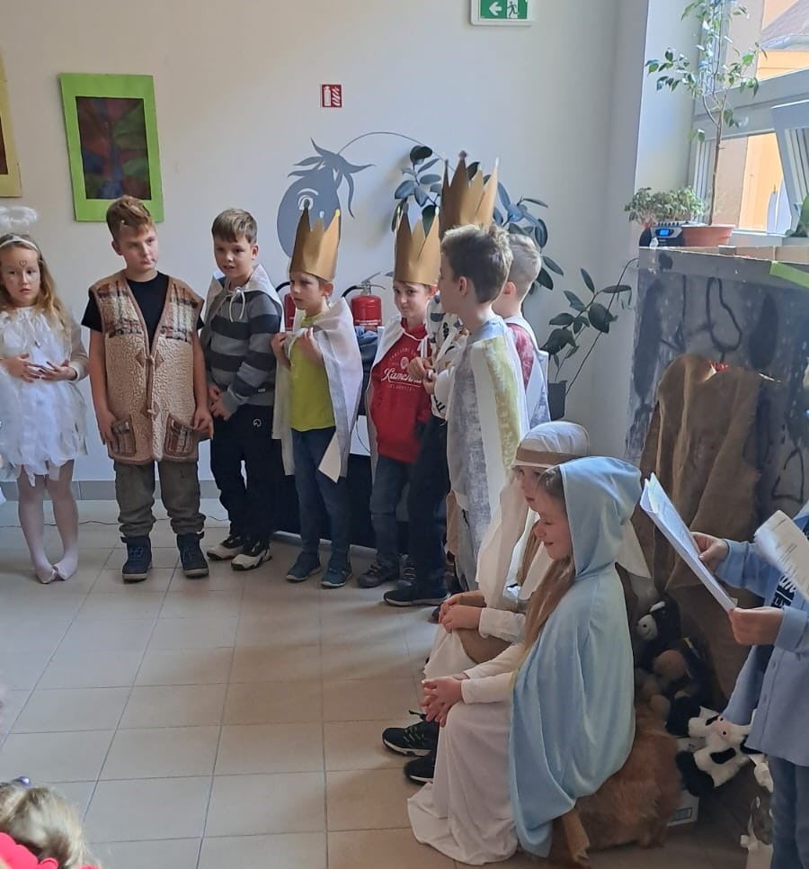 Na předvánoční besídku pro rodiče a prarodiče jsme připravili dramatizaci příběhu o narození Ježíška. Žáci si nejdříve vybrali své role, které se postupně naučili. Vytvořili k pohádce z kartonů rekvizity, učili se vánoční písně, říkanky, tanec a koledy, které celý příběh provází. Naši druháčci měli před vystoupením trochu trému, ale nakonec vše dobře dopadlo. Všichni se velmi snažili a zaslouží si velkou pochvalu.