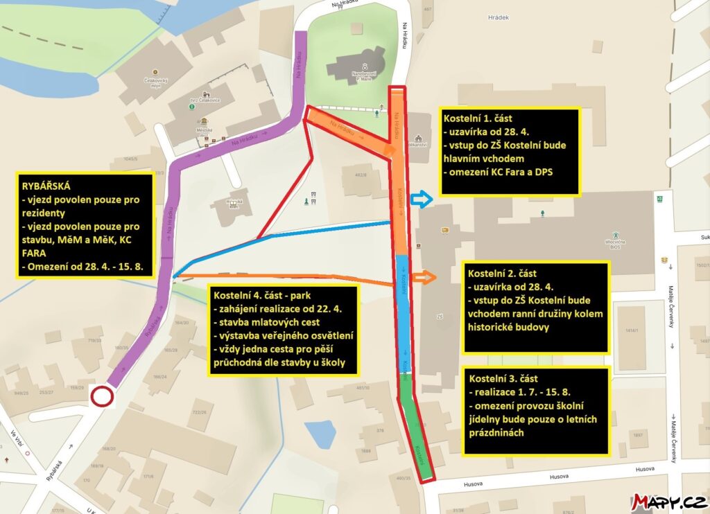 dovolte mi Vás informovat o probíhající rekonstrukci ulice Kostelní. V následujícím období proběhne rekonstrukce ulice Kostelní, parku před školou a další související práce, proto jsme společně se zřizovatelem, zhotovitelem a naší školou připravili informaci k omezení provozu a vstupu do školy, resp. informace o omezeních, vstupech a časovém harmonogramu. V příloze zasílám fotografie pro představu, jak bude provoz ulice Kostelní omezen včetně dopravní situce.