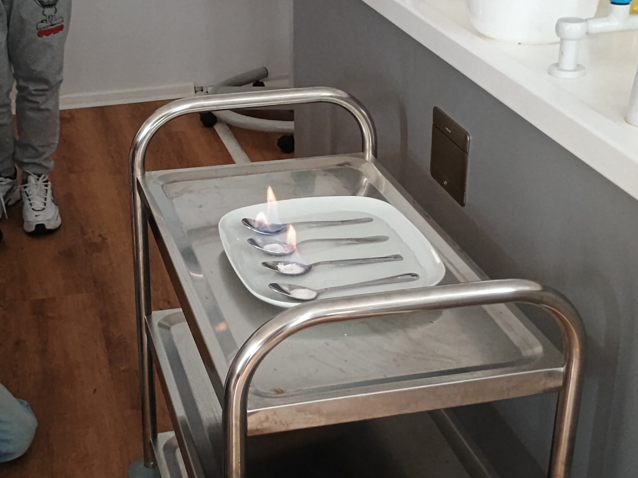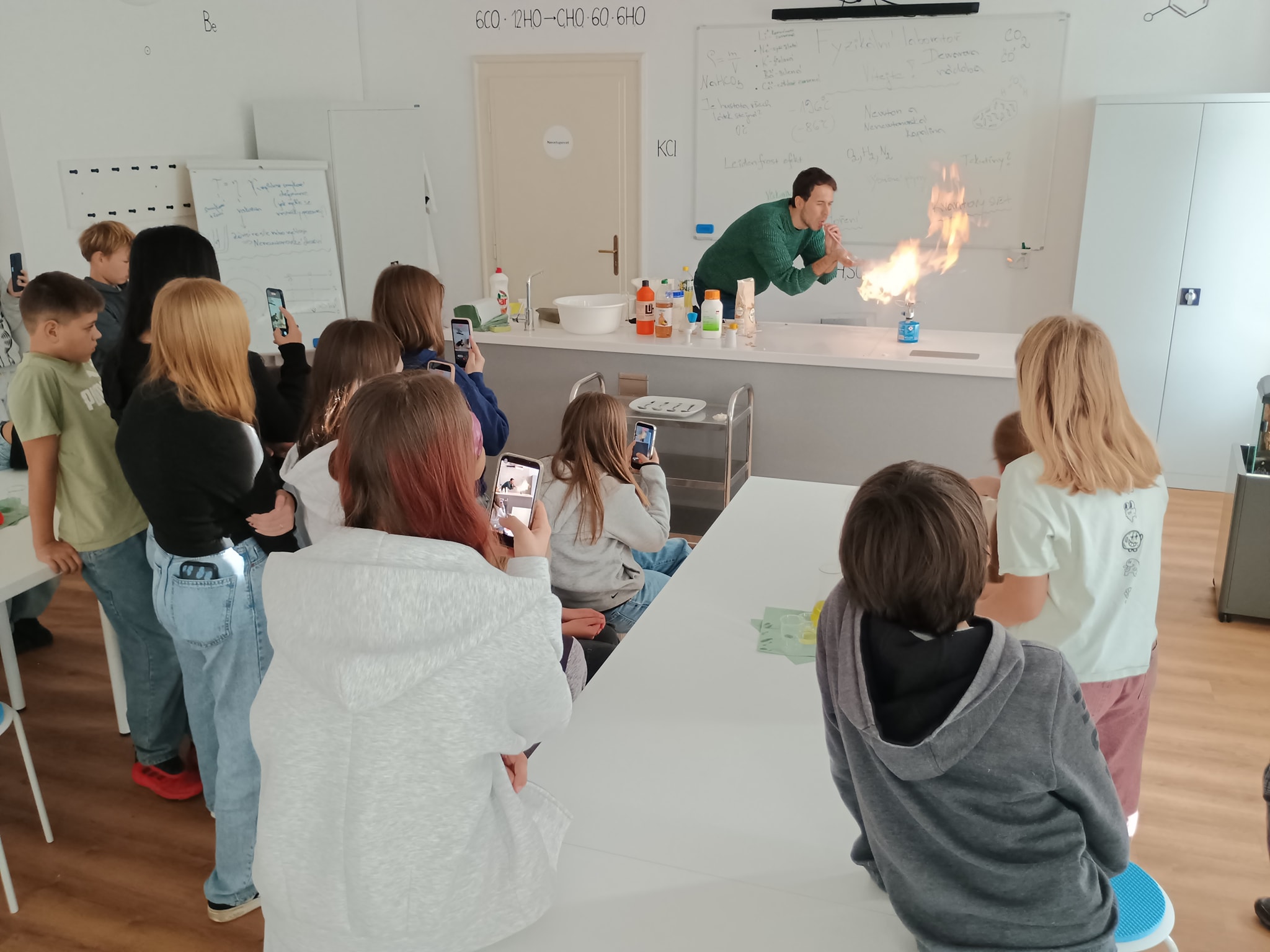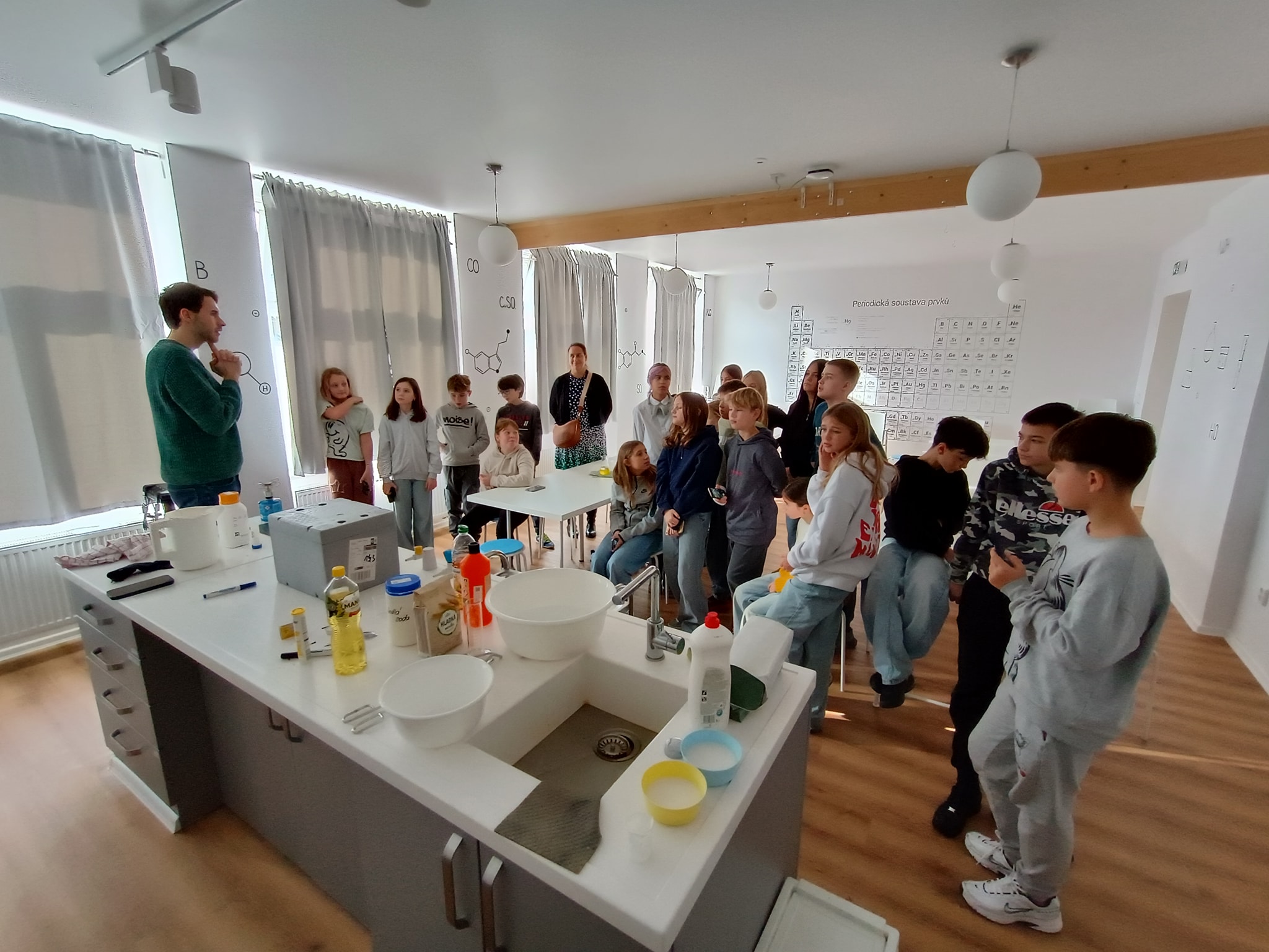 Workshop „Fyzikální laboratoř“ s 6.C – rozdílné hustoty kapalin – jejich smíchání i oddělování, hoření draslíku, sodíku, vápníku, alkoholu a mouky a předvedení tekutého dusíku v praxi.