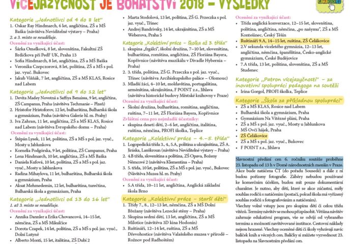Ocenění našich pedagogů a žáků. Vážení pedagogové a rodiče, srdečně Vám gratuluji jménem organizátorů soutěže „Vícejazyčnost je bohatství 2018“ k umístění Vašich žáků a školy v soutěži. Slavnostní předání cen 6. ročníku soutěže proběhne 23. listopadu 2018 od 13 hodin v Domě národnostních menšin v Praze. Mgr. Jitka Peterová